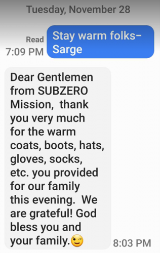 Charity work, while often rewarding, can sometimes feel thankless; worse, it can usually feel like you are making a difference. In the area of need that The Sub Zero Mission fills, it can feel like barely a drop of water in an endless sea of need. Homelessness has only gotten worse since our inception in 2008/2009. The camps are more giant. We now see women and children more regularly. The items we bring are but a few things that the people we find need. Twenty years of war have left a lot of veterans damaged and many homeless.
