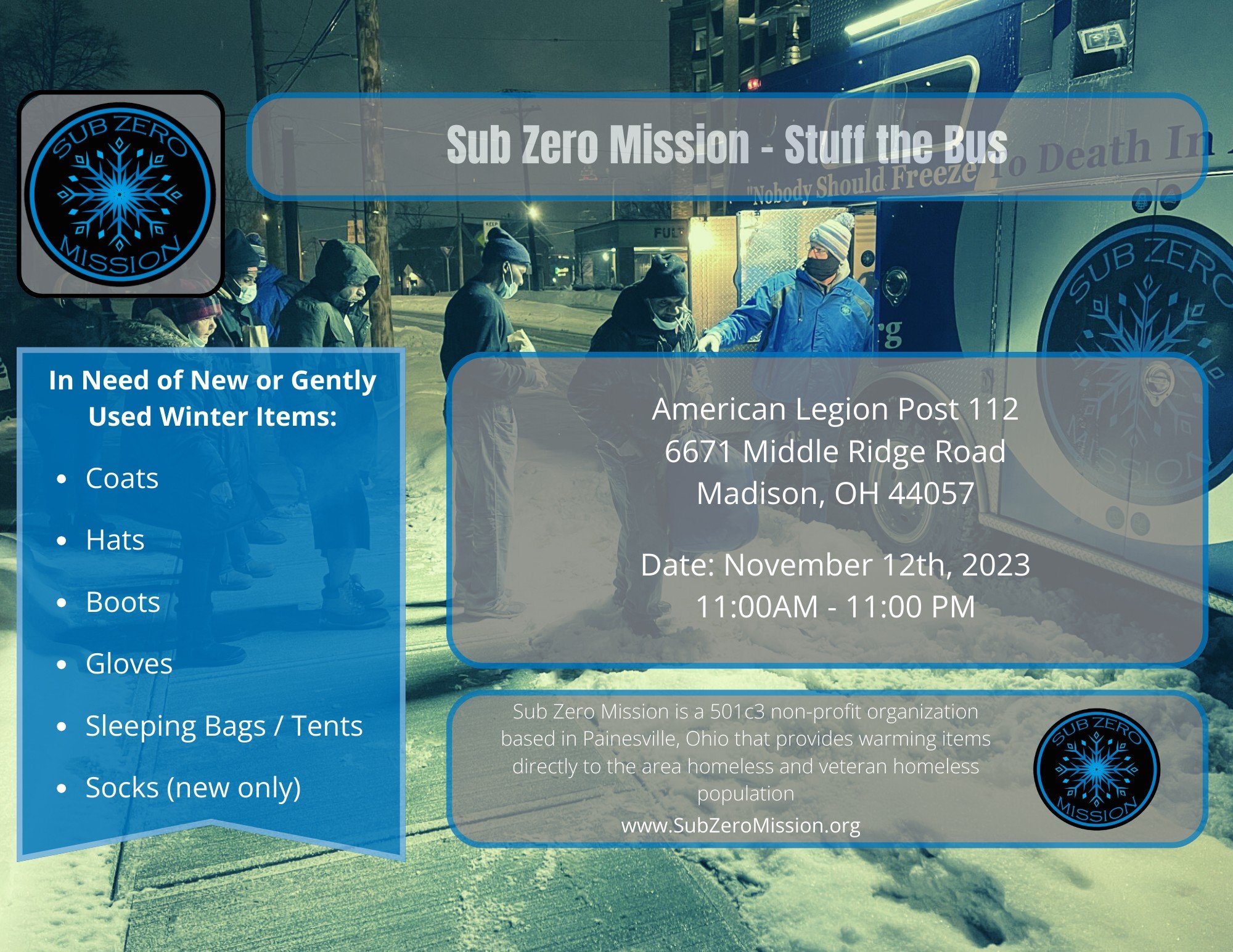 Sub Zero Mission is a 501c3 non-profit organization based in Painesville, Ohio that provides warming items directly to the area homeless and veteran homeless population