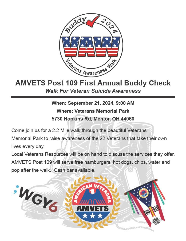 Buddy Check - AMVETS Post 109Join us for a 2.2-mile walk through the beautiful Veterans Memorial Park to raise awareness of the 22 Veterans who take their own lives every day. Local Veterans Resources will be on hand to discuss the services they offer. Free Hot dogs, Hamburgers, chips, pop, and water after a walk.