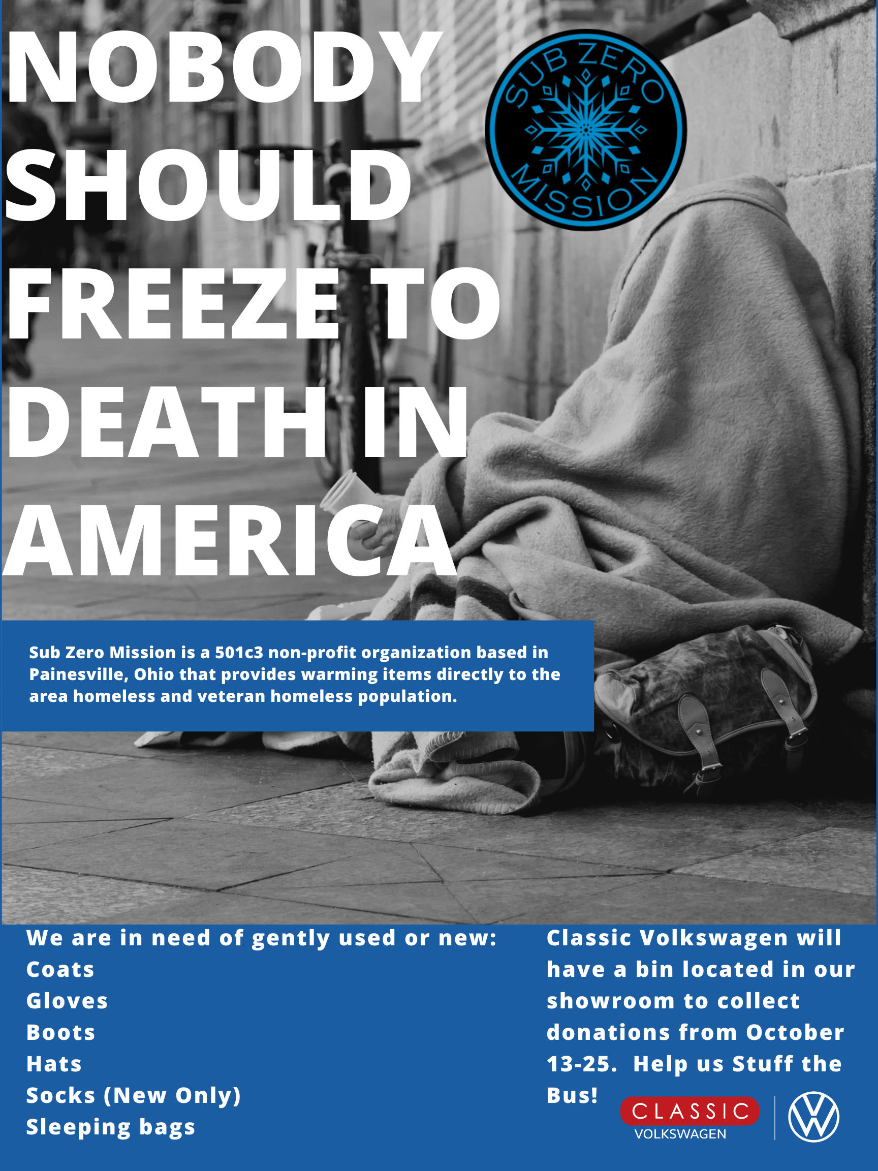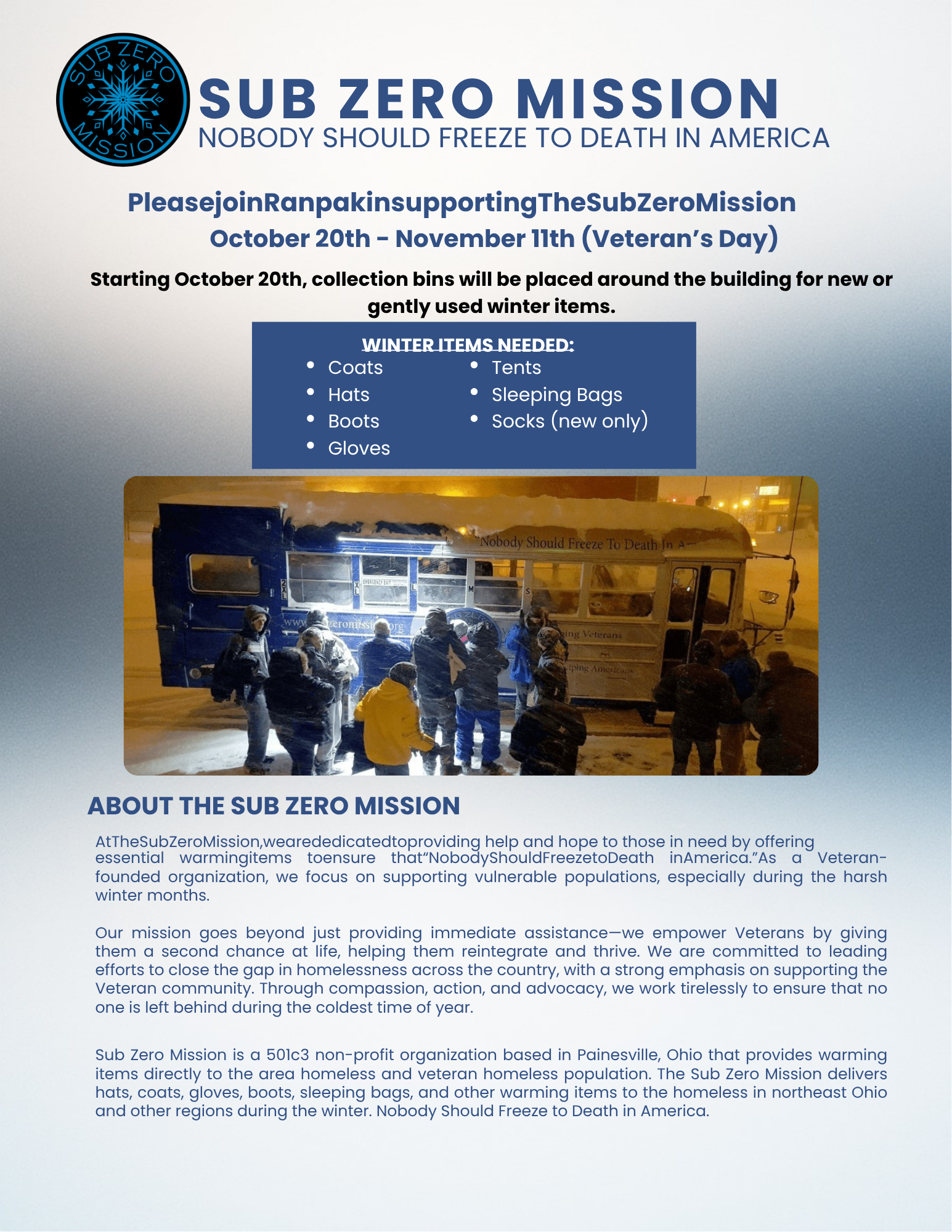 Darkroom Brewing Company 32 North Broadway, Geneva, OHDarkroom Brewing Company is hosting a Sub Zero Mission Stuff the Bus event on October 6th from 6:00 PM to 8:00 PM. We are in need of new or gently used coats, hats, gloves, boots, sleeping bags, tents, and socks (new only).