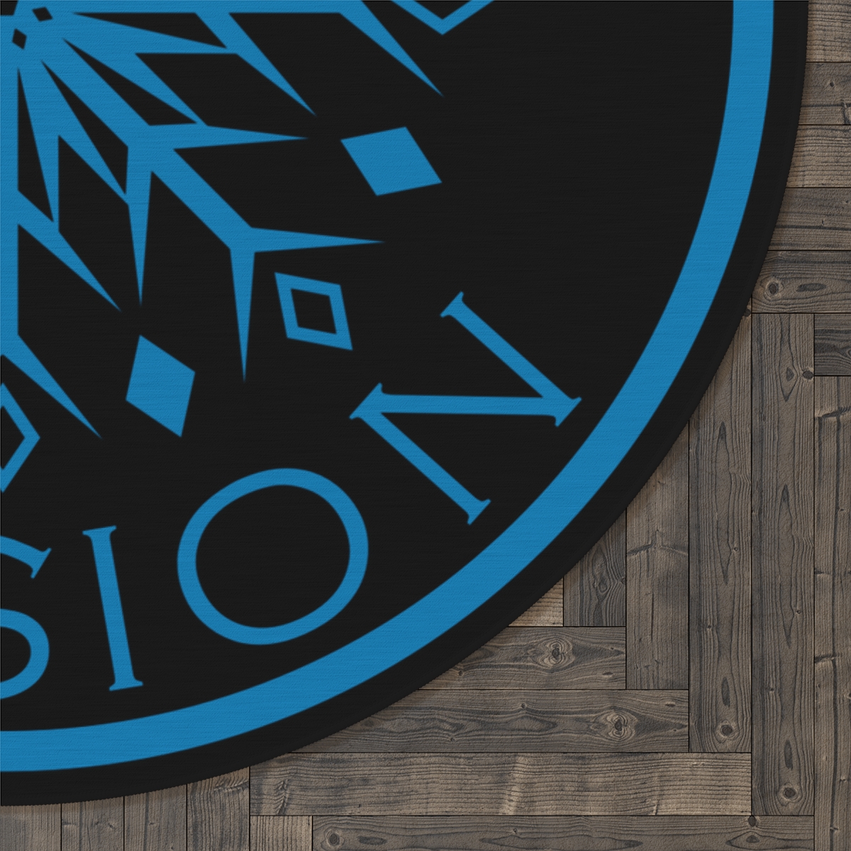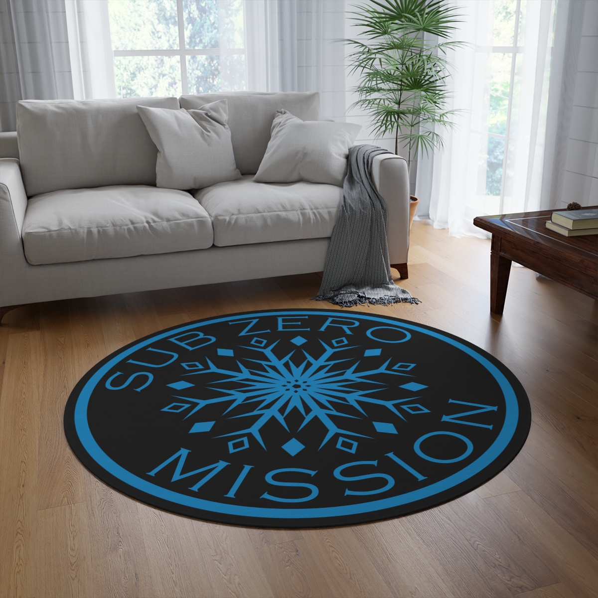 Our snowflake logo is printed on this round 100% polyester chenille rug in picture-perfect quality. It features a coated backing and hemmed edges for durability.
